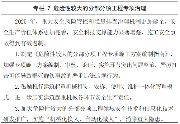 全面推行工程质量安全手册制度,加快健全手册体系,完善建筑施工企业和工程项目安全生产标准化考评制度。研究制定装配式建筑质量安全管理制度,运用信息化手段,实现部品部件生产质量可追溯管理,加强竖向节点连接等施工关键环节质量安全管控。深化施工安全领域“证照分离”改革,推进涉企、涉人证照电子化,实现建筑施工特种作业操作资格证书信息联网和一站式查询。制定建筑工程材料、工艺、设备鼓励应用和限制淘汰名录,推广安全先进适用的建造技术,限制淘汰落后工艺。