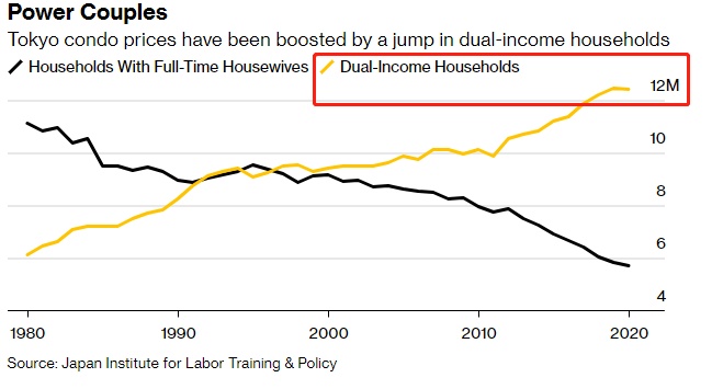 高收入、双收入家庭的增加也被认为是东京新建公寓价格上涨的原因之一。目前,双收入家庭占日本所有家庭的三分之二以上,这与泡沫时代的趋势发生了180度大逆转。