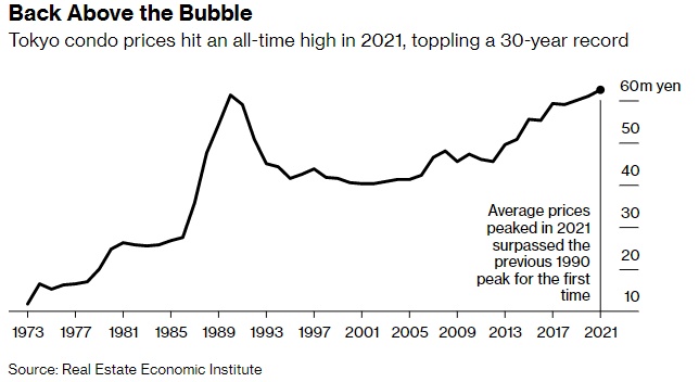 2021年东京新建公寓的平均价格突破30多年来的历史纪录,双收入家庭的需求不断增长、供应短缺及建筑成本不断上升等因素大力提振了日本首都一度停滞不前的住房市场。