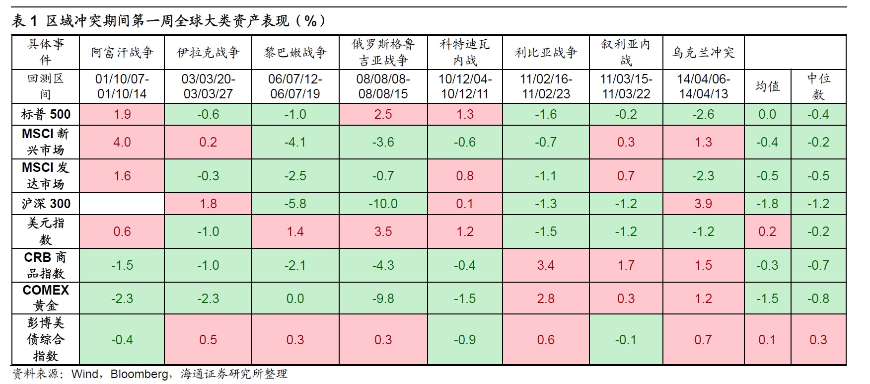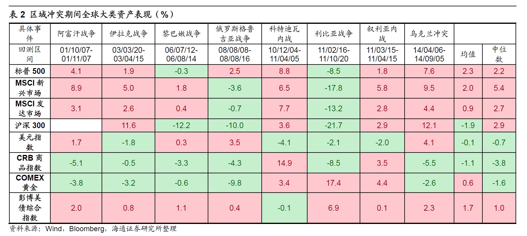 历史上区域冲突事件发生时全球大类资产表现如何?回顾了2000年以来较为典型的国际局部冲突,并回测了期间的全球大类资产表现。可以发现,在发生局部冲突的初期(第一周),全球权益资产在短期内或存在被拖累的可能,而美元和美债的平均相对表现往往更优。但如果进一步观察区域冲突完整时期内大类资产的表现,可以发现拉长时间看国际冲突事件对大类资产影响实际有限。