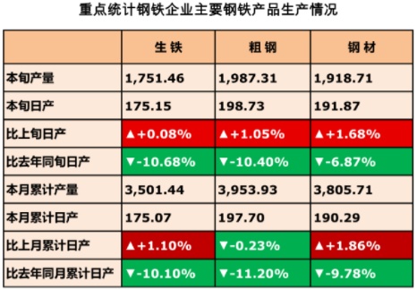 根据重点统计钢铁企业产量进行估算,本旬全国共生产了粗钢2533.96万吨、生铁2096.35万吨、钢材3294.23万吨。本旬全国日产粗钢253.40万吨、环比上升0.65%,日产生铁209.64万吨、环比下降0.05%,日产钢材329.42万吨、环比上升1.05%。