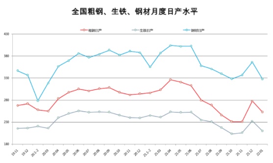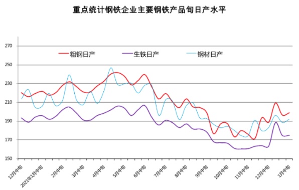 根据1月中旬旬报的统计,1月份(即累计到1月中旬)重点统计钢铁企业累计日产粗钢197.70万吨,环比下降0.23%,同比下降了11.20%;生铁日产175.07万吨,环比增长1.10%,同比下降了10.10%;钢材日产190.29万吨,环比增长1.86%,同比下降了9.78%。