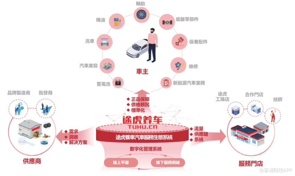 基于此,途虎养车将零散的汽车服务需求聚集,其可满足轮胎和底盘零部件更换到汽车保养、维修、汽车美容等全方位的汽车服务需求,并凭借高效的供应链提供一站式、全数字化、按需服务的体验,打造了一个由车主、供应商、汽车服务门店和其他参与者共同组成的线上线下有机结合的汽车服务生态系统。