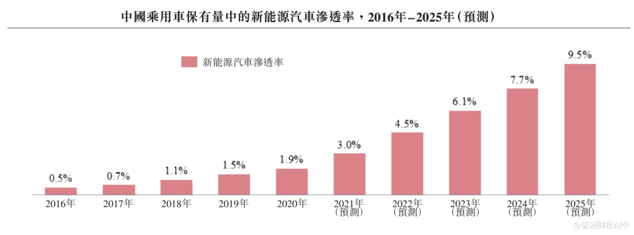 目前中国的新能源乘用车保有量所占的比例仍相对较小,但据灼识咨询数据显示,至2025年时,新能源乘用车的保有量的渗透率预计达到9.5%,较2021年提升6.5个百分点,可谓发展迅速。