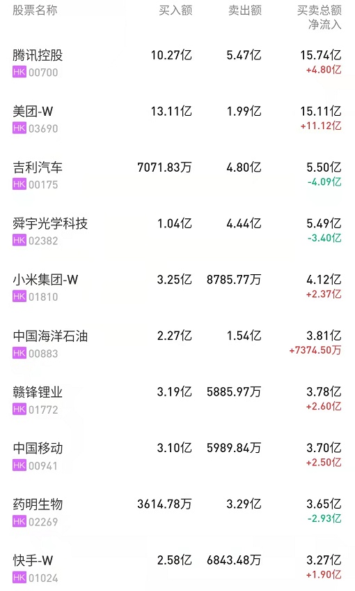 北水净买入最多的个股是美团-W(03690)、腾讯(00700)、赣锋锂业(01772)。北水净卖出最多的个股是中国海外发展(00688)、舜宇光学(02382)、李宁(02331)。