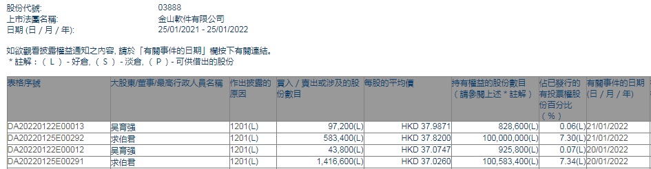 智通财经APP获悉,香港联交所最新资料显示,1月20日,非执行董事求伯君、首席财务官兼执行董事吴育强分别减持金山软件(03888)141.66万股、4.38万股,每股作价分别为37.0260港元、37.0747港元;1月21日,求伯君、吴育强分别减持金山软件58.34万股、9.72万股,每股作价分别为37.8200港元、37.9871港元。两日减持涉及总金额约为7983.14万港元。减持后求伯君、吴育强最新持股数目分别为1亿股、82.86万股,最新持股比例分别为7.30%、0.06%。