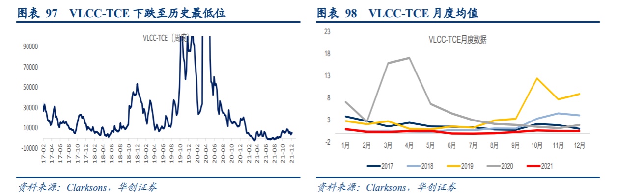 油运方面:供需矛盾凸显,导致油运TCE处于冰点。具体而言,2021年油运VLCC平均TCE水平下跌至三十年来历史最低位,全年维持底部震荡,截至12月10日,年内均值仅约3171美元/天,同比-94%,远低于2.5万美元/天左右的保本点,而油运TCE处于冰点的原因主要是由于“全球石油需求复苏进程承压,存量运力增明显加”这一供需矛盾引起的。