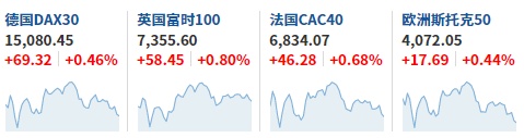2. 截至发稿,德国DAX指数涨0.46%,英国富时100指数涨0.80%,法国CAC40指数涨0.68%,欧洲斯托克50指数涨0.44%。