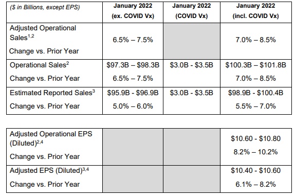 强生预计2022年报告销售额(不包括新冠疫苗收入)为959亿美元-969亿美元,预计新冠疫苗单项销售额为30亿美元-35亿美元;强生预计2022年调整后每股收益为10.4美元至10.6美元,同比增长6.1%-8.2%。
