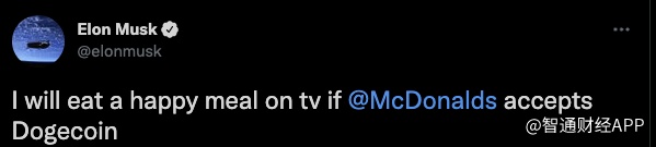 智通财经APP获悉,周二,特斯拉(TSLA.US)CEO马斯克在社交媒体上表示,麦当劳(MCD.US)应该接受狗狗币作为一种支付方式,并表示如果麦当劳接受了,他会直播吃一顿开心乐园套餐。