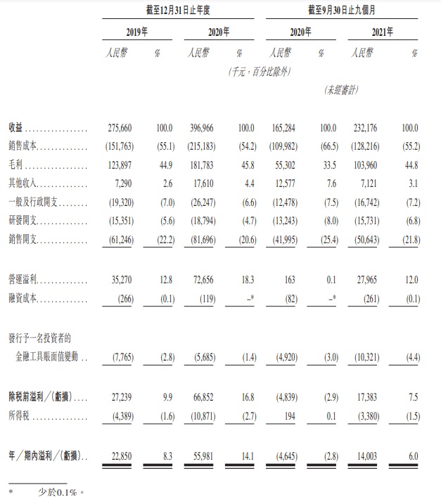 截至2019年、2020年、2021年9月30日止年度,公司的收益分别为2.76亿元、3.97亿元、2.32亿元(人民币,下同);该期间的毛利为1.24亿元、1.82亿元、1.04亿元。