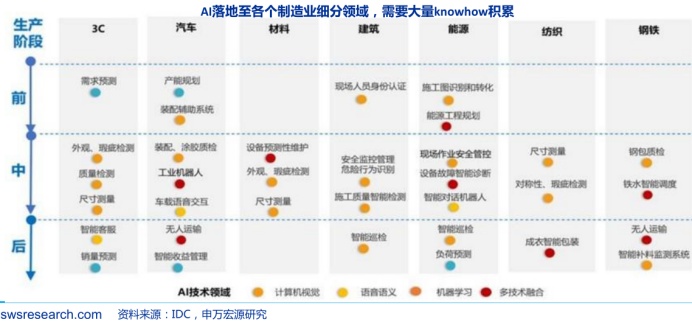 据申万宏源在研报中指出,AI技术落地至制造业的应用场景丰富,当中典型的应用场景包括:智能质检、智能设备运维、智能巡检如电力、能源、化工等企业的智能监控、智能巡检、智能预警等。而这一过程中,企业对于行业knowhow的积累则成为关键。