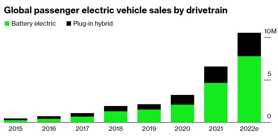 智通财经APP了解到,分析师预计今年插电式汽车的销量将略高于1000万辆,约占全球汽车总销量的14%,高于2021年的660万辆和2020年的320万辆。其中包括插电式混合动力车,但大多数销售车辆将是纯电动的。