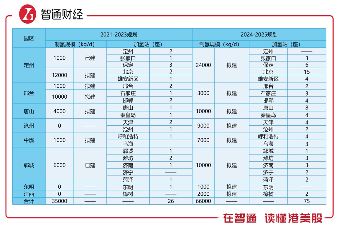 该公司已布局的氢能项目包括:定州园区一期氢能项目已于2020年7月投产,二期项目预计将于2022年5月投产;邢台园区一期制氢及加氢撬装站示范项目, 2022年1月底实现投产;另外还有多个地区的加氢站项目正在建设。根据该公司规划,到2025年制氢规模达到66000kg/d,加氢站规模达到75座。