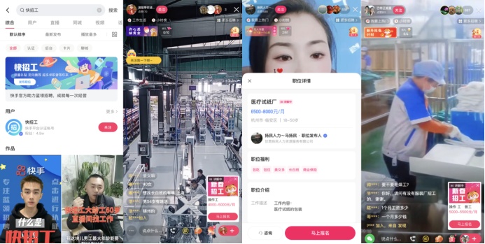 1月26日,快手APP上显示,部分账号的直播间内上线了直播招聘功能,从产品页面可以看出,该产品是快手新推出的招聘平台“快招工”。与传统招聘模式不同,“直播招聘”无需投递简历,只需留下联系方式,即可完成职位投递。简易化的操作更适合蓝领群体。