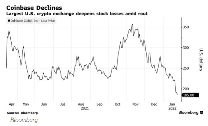 Coinbase周二收跌3.06%,至185.63美元。在经历了三天的下跌后,该股股价已较去年11月的高点下跌近50%。