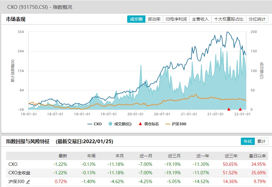 中欧医疗健康及中欧医疗创新前十大重仓股基本保持一致,仅个股持仓占比有所不同。两只基金同时重仓的药明康德(603259.SH)、凯莱英(002821.SZ)、康龙化成(300759.SZ)、泰格医药(300347.SZ)、博腾股份(300363.SZ)等均为CXO板块指数权重占比前列的股票。Wind数据显示,CXO板块近三个月跌幅达19.19%