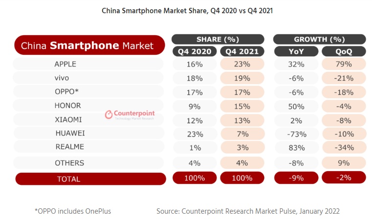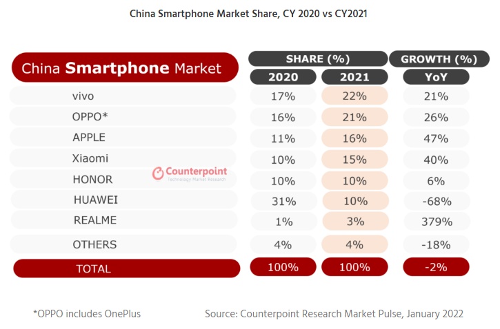 回望2021年,受上游核心零部件供应持续紧缺、国内多地疫情反复、消费市场购买力下滑等多种因素影响,整个智能手机市场表现不容乐观。2021年中国市场智能手机销量约3.14亿部,同比上升3%。下半年仅贡献全年48.5%的销量,市场表现不及预期。2021年,OPPO、vivo前三季度表现强劲,站稳第一和第二的位置,尤其在国内1K-3K中低端主力市场表现突出。华为逐渐淡出国内前五,其他品牌意欲争夺华为份额,市场竞争加剧。第四季度苹果(AAPL.US)在其新品iPhone13系列强势表现带动下跃居国内第一,在5K以上高端市场独占鳌头,其份额由2020年的48%大幅增长至75%,抢占了原华为高端市场份额。荣耀在经历了上半年的调整期之后,下半年多款新机密集发布,带动荣耀在第三季度连续三个月位居国内第三。
