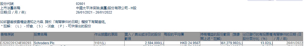 智通财经APP获悉,香港联交所最新资料显示,1月20日,Schroders PLC增持中国太保(02601)259.4万股,每股作价24.9567港元,总金额约为6473.77万港元。增持后最新持股数目约为3.61亿股,最新持股比例为13.02%。