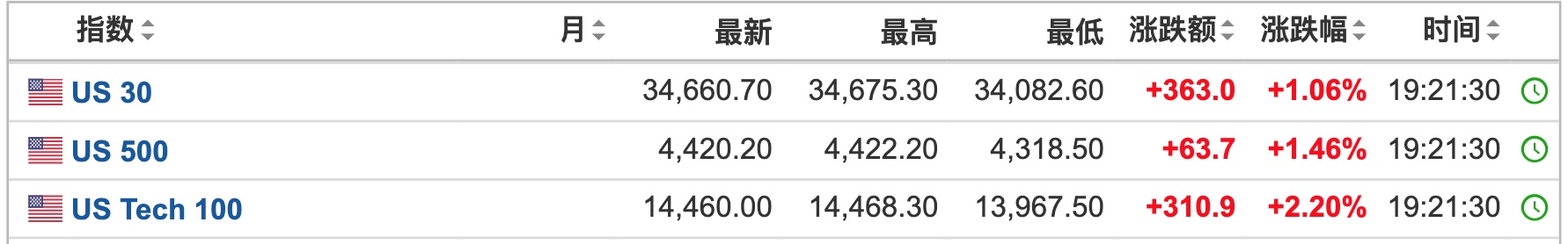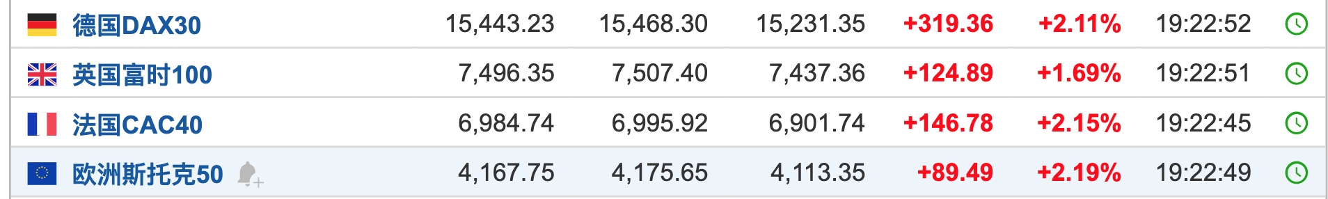 2. 截至发稿,德国DAX指数涨2.11%,英国富时100指数涨1.69%,法国CAC40指数涨2.15%,欧洲斯托克50指数涨2.19%。