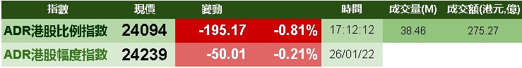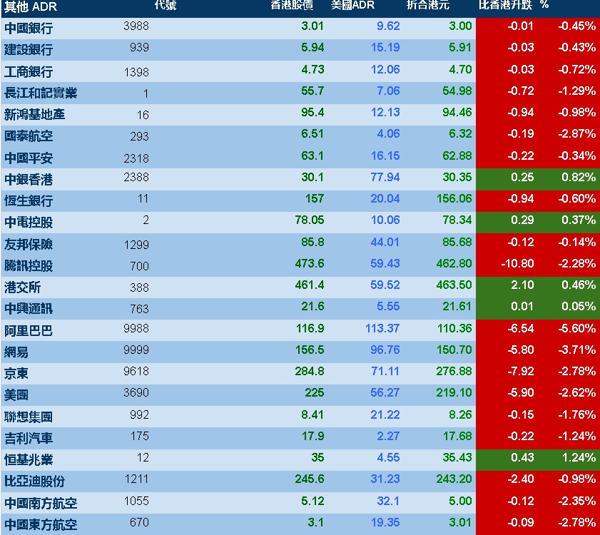 智通财经APP获悉,周三美股三大指数涨跌不一,港股ADR指数,按比例计算,收报24094点,跌195.17点或0.81%。