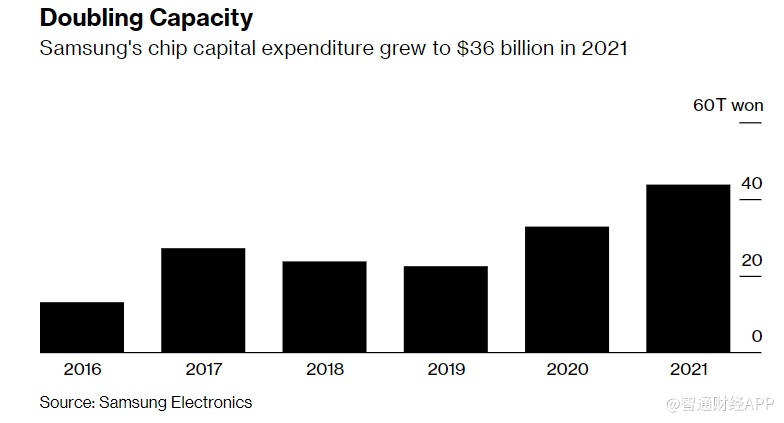 三星电子表示,2021年的资本支出为48.2万亿韩元,其中芯片支出为43.6万亿韩元(约363亿美元)。相比之下, 台积电(TSM.US)则在芯片方面的资本支出为 300 亿美元。