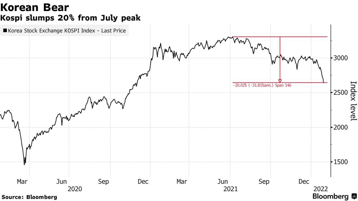 智通财经APP获悉,由于外国投资者在美联储公布1月利率决议后纷纷撤出、LG能源上市吸引了股市中大部分流动性以及乌克兰局势的影响下,韩国股市卖压加剧,Kospi指数(韩国综合股价指数)进入熊市。