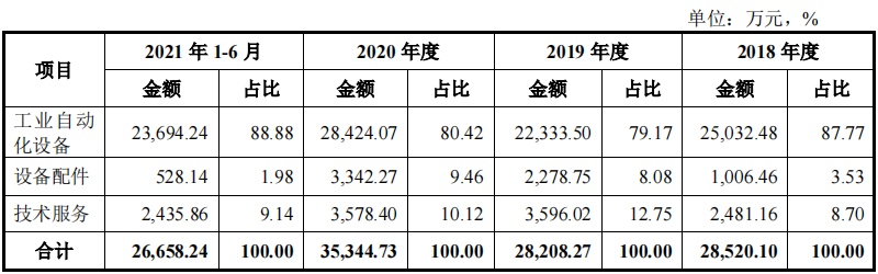 拆分收入结构来看,智立方的收入来源包括工业自动化设备、设备配件和技术服务三大块。其中,工业自动化设备是公司的第一大收入来源,期内分别带来收入2.5亿元、2.23亿元、2.84亿元、2.37亿元,占总收入的比例为87.77%、79.17%、80.42%、88.88%。