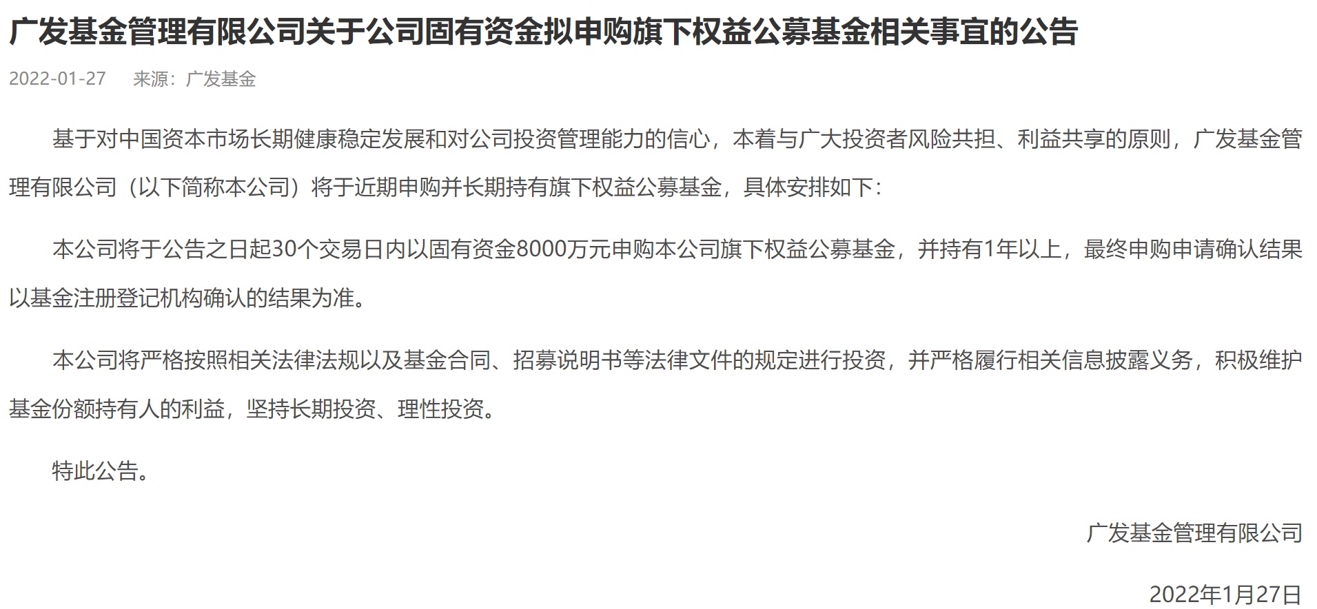 智通财经APP获悉,1月27日,广发基金发布公告,基于对中国资本市场长期健康稳定发展和对公司投资管理能力的信心,本着与广大投资者风险共担、利益共享的原则,广发基金管理有限公司将于近期申购并长期持有旗下权益公募基金,公司将于公告之日起30个交易日内以固有资金8000万元申购本公司旗下权益公募基金,并持有1年以上,最终申购申请确认结果以基金注册登记机构确认的结果为准。