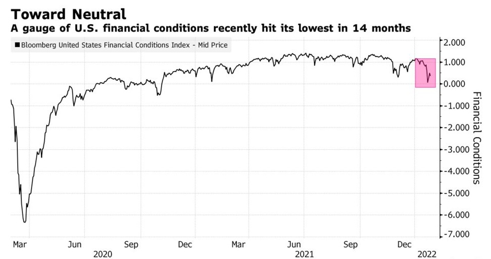 在鲍威尔表示政策必须"灵活"以应对包括通胀在内的风险后,市场正在调整,10年期美国国债收益率周三跳升近10个基点,芝加哥期权交易所波动率指数(VIX)收于31.96,为一年来最高水平。与此同时,Bloomberg美国金融状况指数周一跌至2020年11月以来的最低水平,但仍处于积极区间。