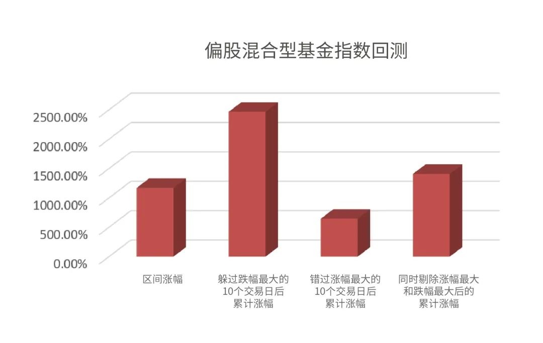 让我们依然以偏股混合型基金指数(885001)为例,从指数2003年12月31日成立到2021年12月31日间,累计收益为1170.12%,涨了十一倍多。而如果我们能够精准躲过跌幅最大的十个交易日,那我们能够将收益率再整整翻一倍,达到惊人的2466%!
