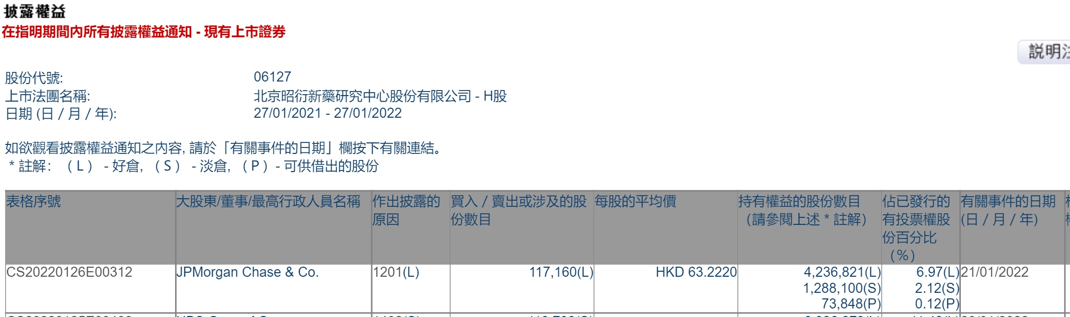 智通财经APP获悉,香港联交所最新资料显示,1月21日,小摩减持昭衍新药(06127)11.716万股,每股作价63.222港元,总金额约为740.71万港元。减持后最新持股数目约为423.68万股,最新持股比例为6.97%。