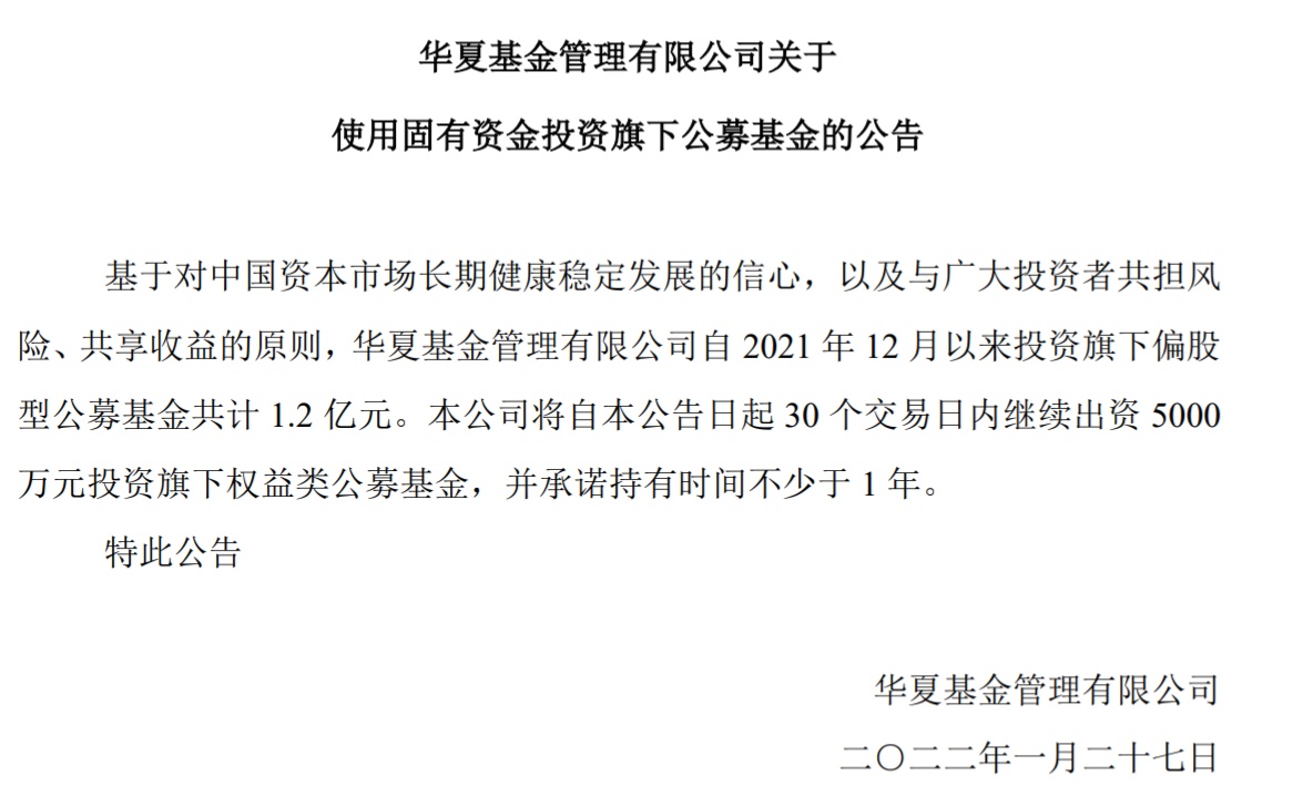 智通财经APP获悉,华夏基金官网发布公告,基于对中国资本市场长期健康稳定发展的信心,以及与广大投资者共担风险、共享收益的原则,华夏基金管理有限公司自2021年12月以来投资旗下偏股型公募基金共计1.2亿元。公司将自本公告日起30个交易日内继续出资5000万元投资旗下权益类公募基金,并承诺持有时间不少于1年。