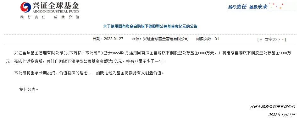智通财经APP获悉,1月27日,兴证全球基金发布公告称,公司已于2022年1月运用固有自基金自购旗下偏股型公募基金8000万元,并将继续自购旗下偏股型公募基金2000万元。完成上述投资后,共计自购旗下偏股型公募基金金额达1亿元,持有期限不少于一年。