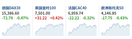 2. 截至发稿,德国DAX指数跌0.47%,英国富时100指数涨0.42%,法国CAC40指数跌0.32%,欧洲斯托克50指数跌0.43%。