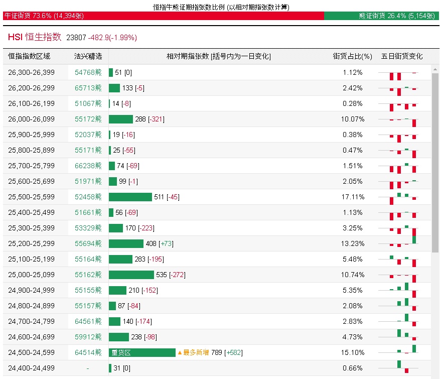 法兴恒指牛熊证街货分布图中的数据显示,熊证街货重货区在24500-24599区间,该区间最新熊证数量为789张,较上一交易日增加582张;最多新增在同一区间。
