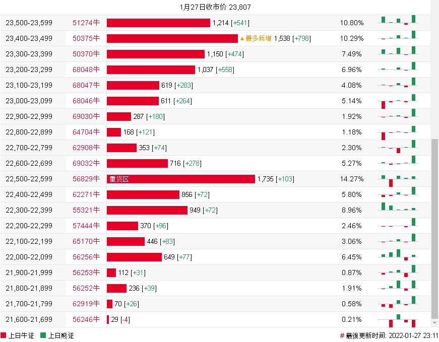 牛证街货重货区在22500-22599区间,该区间最新牛证数量为1735张,较上一交易日增加103张;最多新增在23400-23499区间,该区间最新牛证数量为1538张,较上一交易日增加798张。