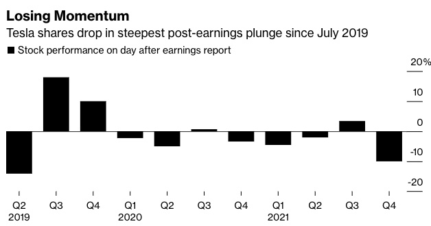 智通财经APP获悉,由于电动汽车制造商特斯拉(TSLA.US)公布的第四季度收益和前景未能给投资者留下深刻印象,该公司股价在一天之内蒸发了约1090亿美元。