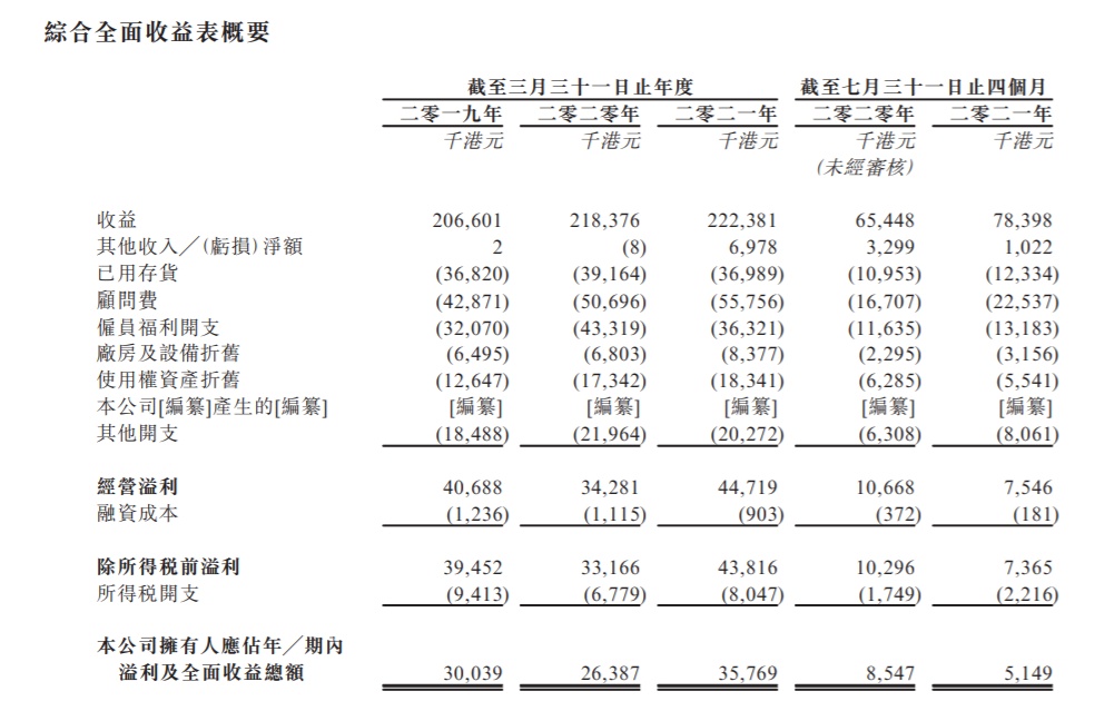 财务方面,据招股书显示,于2019年,2020年,2021年及截至2021年7月31日止四个月,公司的收益分别为2.07亿港元,2.18亿港元,2.22亿港元及7839.8万港元。顾问费(所支付医生工资)分别为4287.1万港元,5069.6万港元,5575.6万港元及1233.4万港元。期内溢利及全面收益总额分别为3003.9万港元,2638.7万港元,3576.9万港元及514.9万港元。