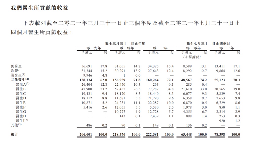 另外,公司拥有11名经验丰富的执业医生,其中两名(即刘医生及许医生)为股东,并将于上市后持有公司权益。治疗服务由医生在前线员工的协助下进行。清晰医疗目前在职医生10人,公司的收益几乎全部源自医生,下表为医生所贡献的收益: