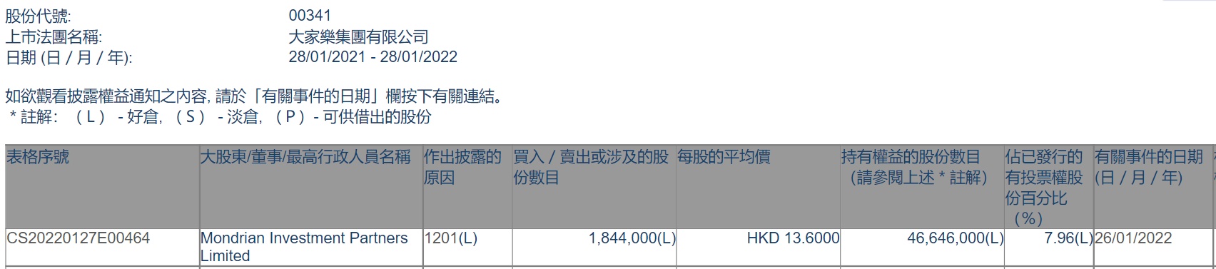 智通财经APP获悉,香港联交所最新资料显示,1月26日,Mondrian Investment Partners Limited减持大家乐(00341)184.4万股,每股作价13.6港元,总金额为2507.84万港元。减持后最新持股数目约为4664.6万股,最新持股比例为7.96%。