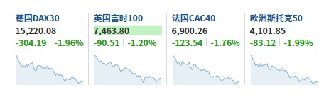 受以上数据影响,欧股全线走低,截至发稿德国DAX指数跌1.96%,欧洲斯托克50指数跌1.99%,法国CAC40指数跌1.76%。