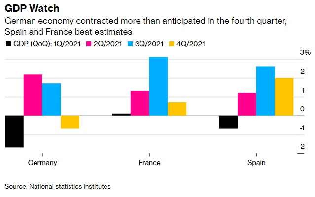 在此数据公布的前一个小时,德国公布的第四季度经济产出环比萎缩0.7%,是经济学家预期的两倍多。乐观的一面是,法国和西班牙的经济增长快于此前预期。