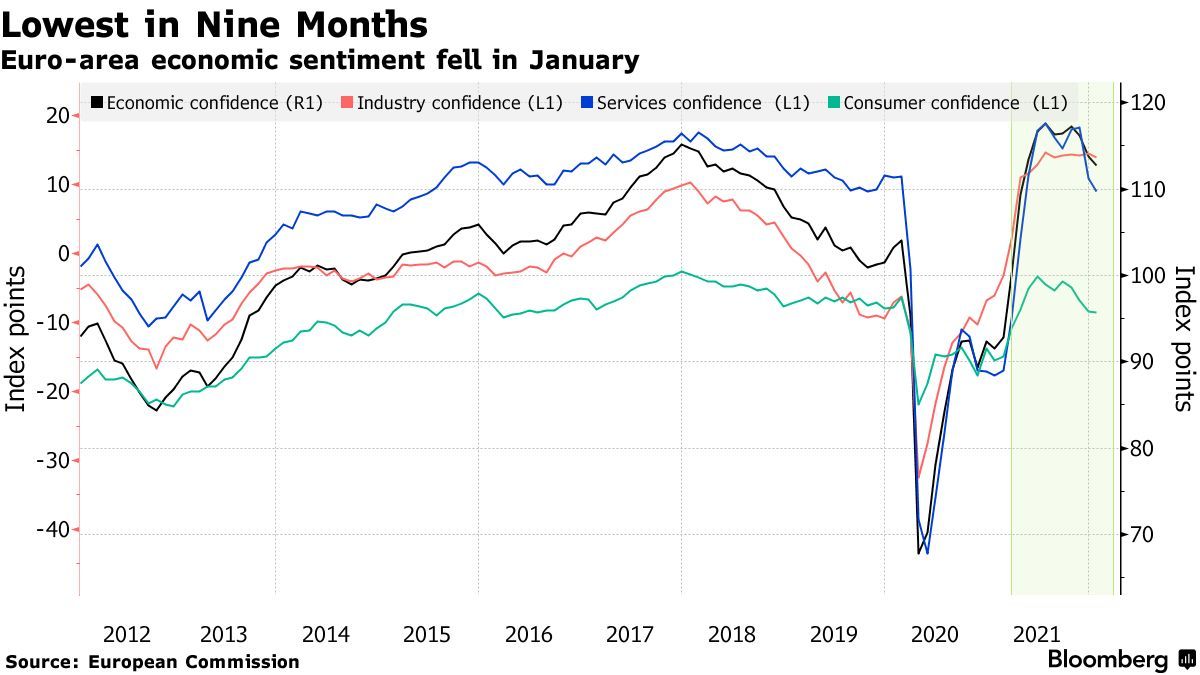 1月份,由于业务扩张和需求令人失望,服务业的情绪受到严重影响。在去年年底,德国和西班牙个人消费有所下降,而法国的消费者则推动了经济增长。
