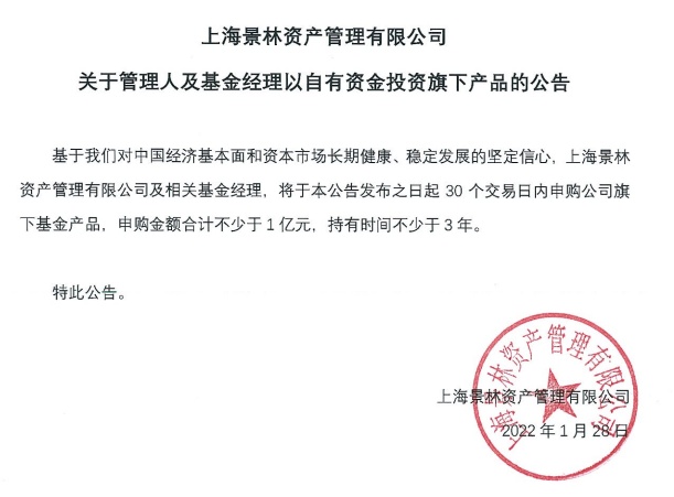 智通财经APP获悉,1月28日,百亿私募景林资产发布公告称,基于对中国经济基本面和资本市场长期健康、稳定发展的坚定信心,该公司及相关基金经理,将于本公告发布之日起30个交易日内申购公司旗下基金产品,申购金额合计不少于1亿元,持有时间不少于3年。
