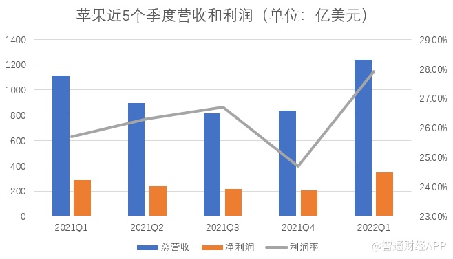 智通财经APP获悉,1月28日早间,苹果(AAPL.US)公布截至12月25日的2022财年第一季度业绩。财报显示,苹果Q1营收同比增长11%至1239亿美元,超出市场预期值1191亿美元,为有史以来最高的单季营收。