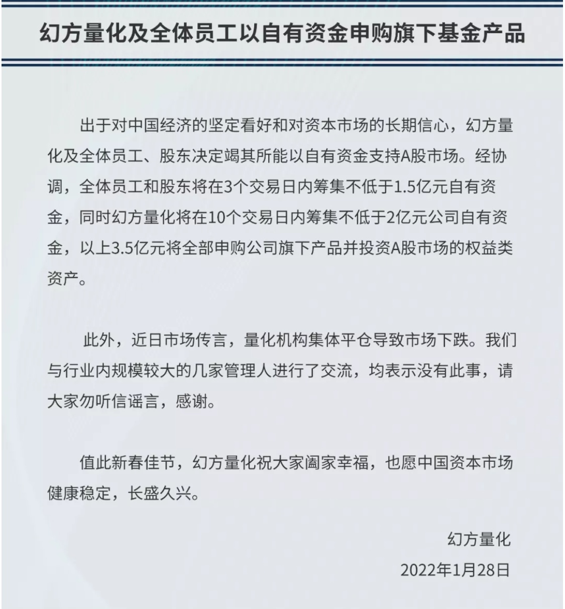 智通财经APP获悉,1月28日,顶尖量化私募幻方量化晚间宣布,出于对中国经济的坚定看好和对资本市场的长期信心,该公司及全体员工、股东决定竭其所能以自有资金支持A股市场。经协调,全体员工和股东将在3个交易日内筹集不低于15亿元自有资金,同时幻方量化将在10个交易日内筹集不低于2亿元公司自有资金,以上3.5亿元将全部申购公司旗下产品并投资A股市场的权益类资产。对于近日市场传言量化机构集体平仓导致市场下跌,该公司称已与行业内规模较大的几家管理人进行了交流,均表示没有此事,请大家勿听信谣言。