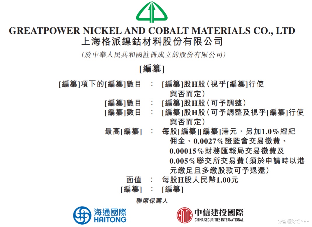 智通财经APP获悉,据港交所1月28日披露,上海格派镍钴材料股份有限公司向港交所主板提交上市申请,海通国际及中信建投国际为联席保荐人。