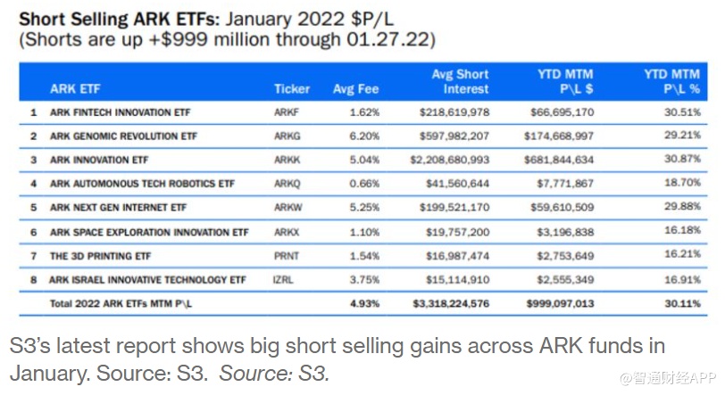 智通财经APP获悉,周五,据分析公司S3 Partners称,在2022年做空“木头姐”凯西·伍德旗下基金的交易员们本月赚的钱已经超过了他们在2021年全年赚的钱。