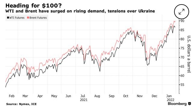 WTI原油和布伦特原油价格均因需求上升和乌克兰局势紧张而飙升